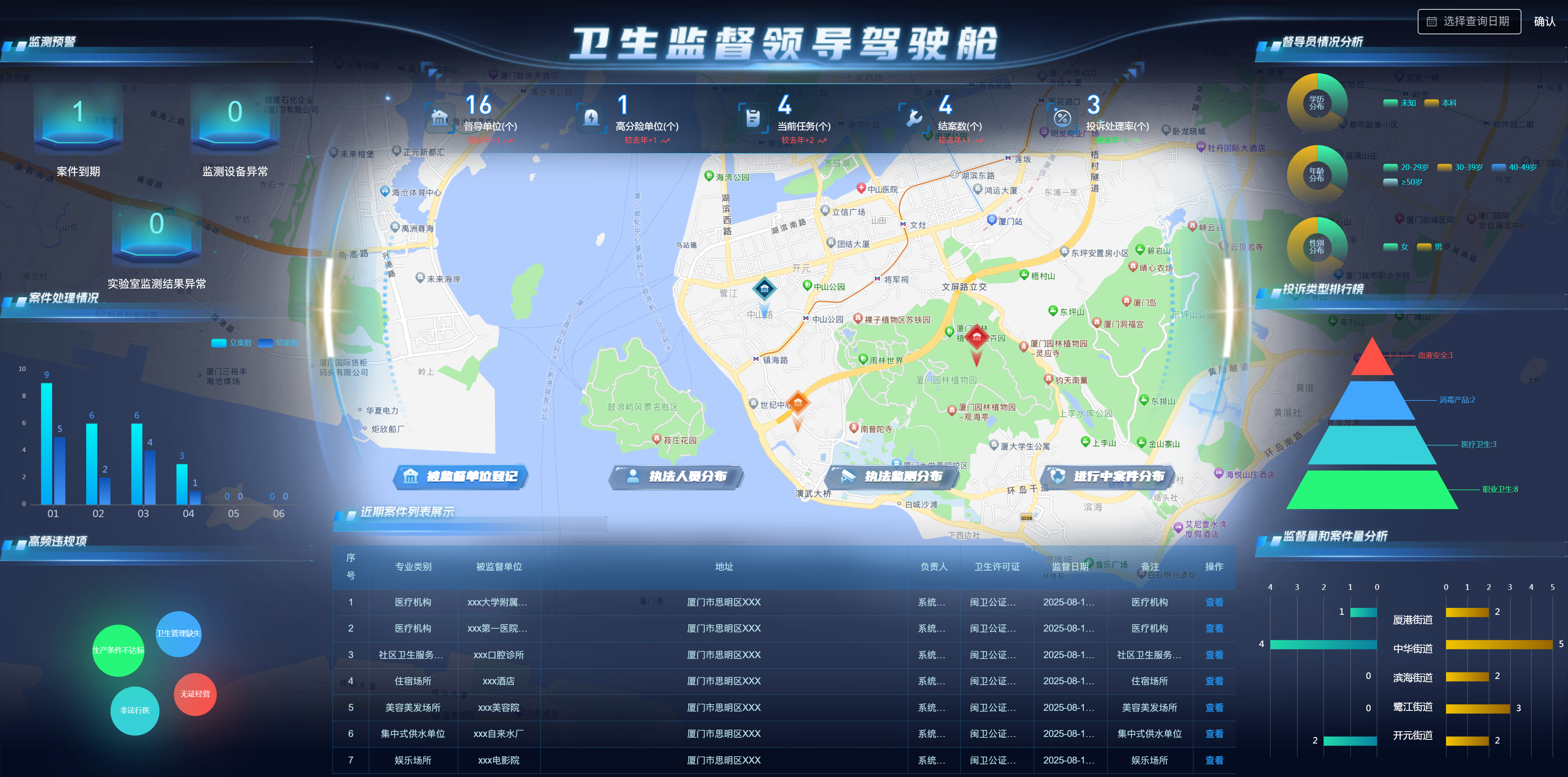 “智慧衛(wèi)監(jiān)綜合監(jiān)管服務(wù)管理系統(tǒng)”涵蓋監(jiān)督執(zhí)法應(yīng)用、非現(xiàn)場(chǎng)執(zhí)法應(yīng)用、碼上監(jiān)管、可視化駕駛艙、信息交換系統(tǒng)等內(nèi)容,實(shí)現(xiàn)加強(qiáng)衛(wèi)生監(jiān)督綜合執(zhí)法能力建設(shè),依法推進(jìn)衛(wèi)生監(jiān)督工作,不斷創(chuàng)新衛(wèi)生監(jiān)督執(zhí)法手段,提高衛(wèi)生監(jiān)督的監(jiān)管和應(yīng)急處置水平,通過(guò)建設(shè)智慧衛(wèi)監(jiān)系統(tǒng),將傳統(tǒng)現(xiàn)場(chǎng)監(jiān)管與非現(xiàn)場(chǎng)物聯(lián)網(wǎng)智能監(jiān)督監(jiān)測(cè)手段相結(jié)合,解決目前衛(wèi)生監(jiān)督機(jī)構(gòu)無(wú)法及時(shí)掌握和處置突發(fā)狀況的問(wèn)題,做到在第一時(shí)間獲取現(xiàn)場(chǎng)數(shù)據(jù),在事件發(fā)生、升級(jí)前提前預(yù)警和處置,提高執(zhí)法效率。